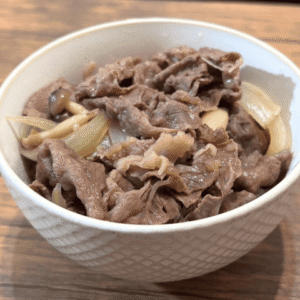 白ワインを効かせた、ほんのり上品な甘辛つゆがクセになる牛丼。