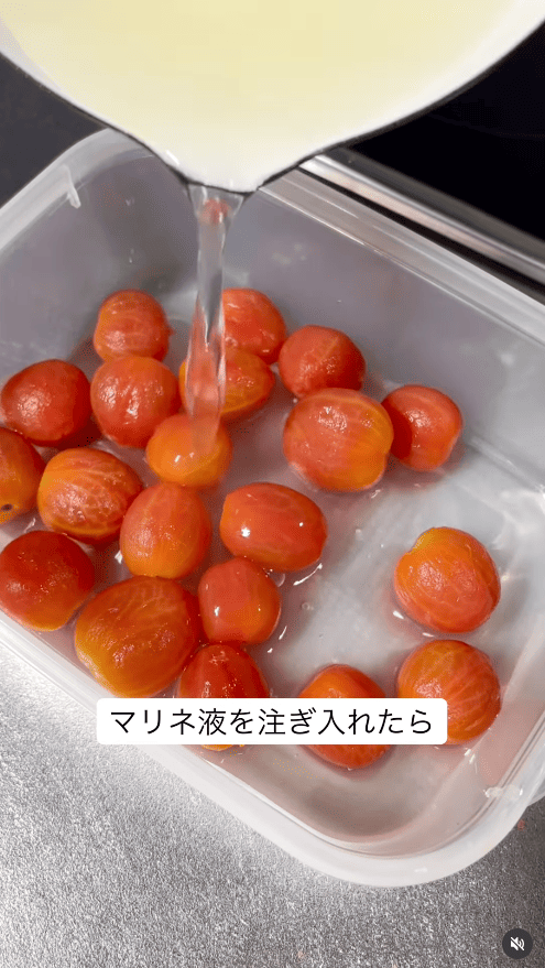 9.タッパーなどの保存容器にミニトマトを並べ、マリネ液をそっと流し込む。