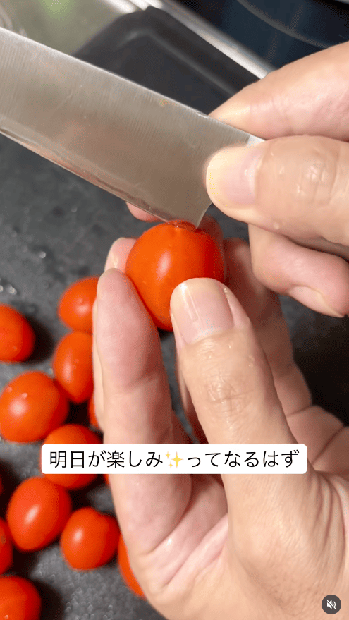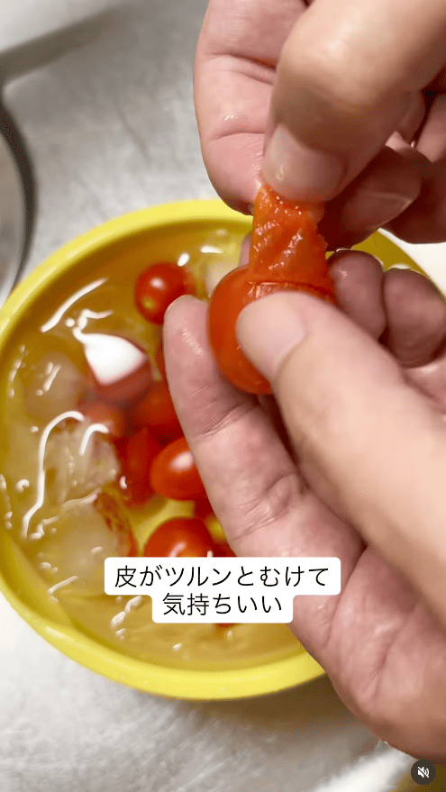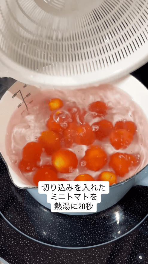 1.ミニトマトのヘタを取り、十字に小さく切れ込みを入れる。
