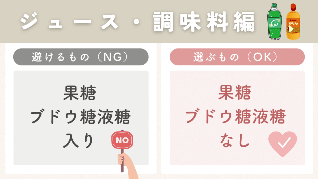 5. ジュース・調味料:なるべく「果糖ブドウ糖液糖が入っていない」ものを選ぶ