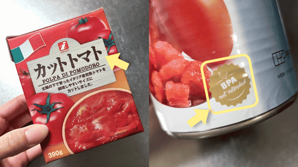 夫はパスタが好きなのでトマト缶を買うことがよくあるのですが、最近は、パッケージに「BPAフリー」と記載があるものや、紙パック入りのカットトマトを選ぶようにしています。