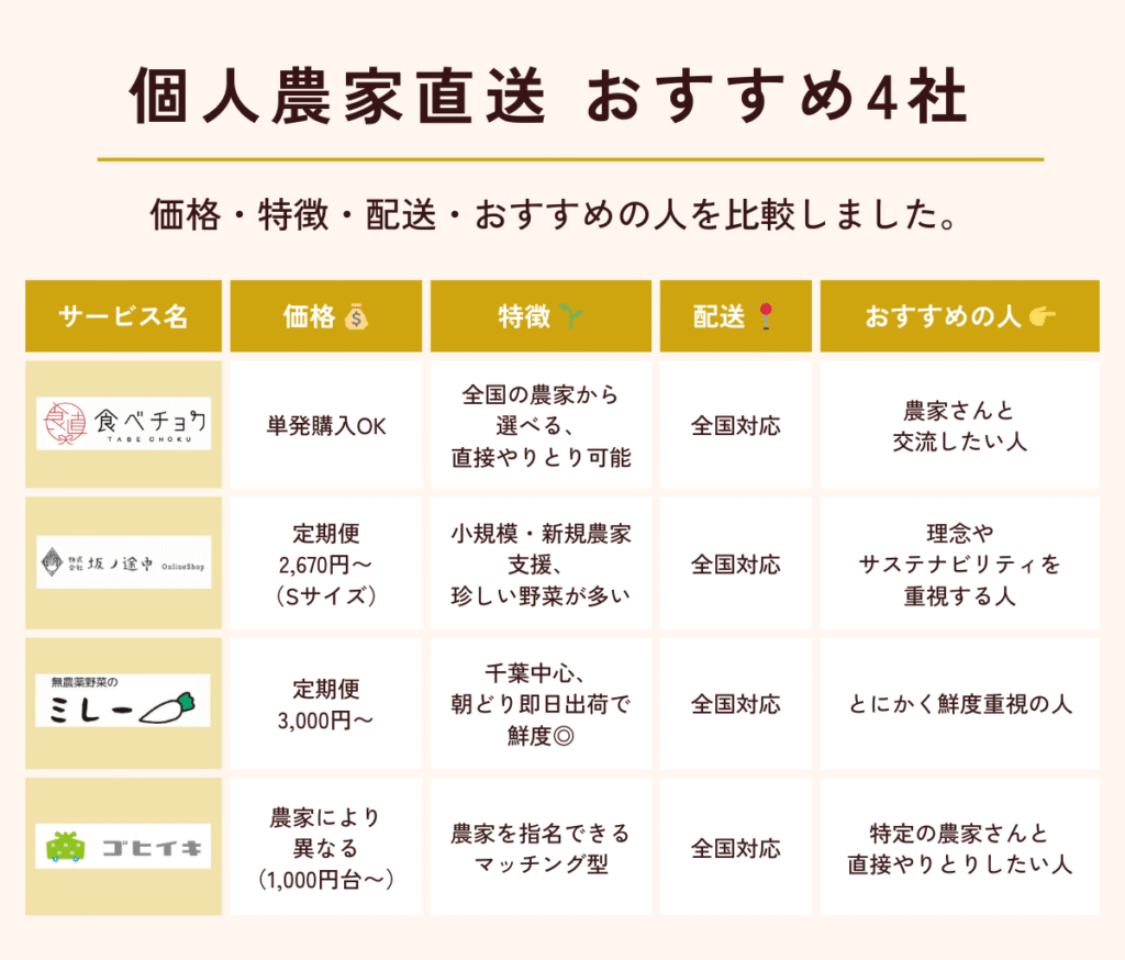 ここからは、おすすめの「農家直送・個人農家宅配サービス」を4つご紹介します。