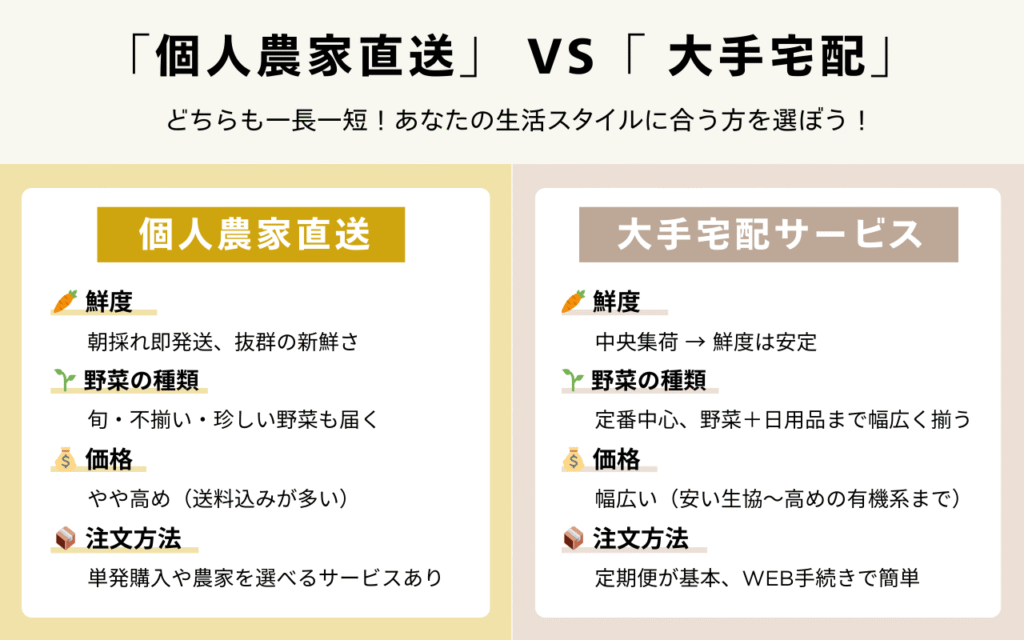 個人農家から直接届く宅配と、オイシックスやコープなどの大手宅配サービスには、それぞれ異なる特徴があります。