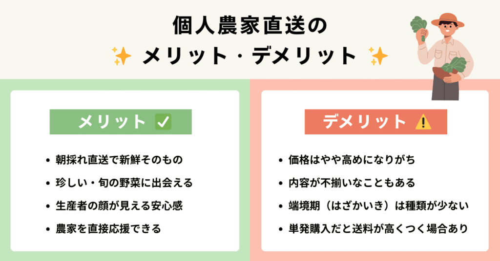 まずは、個人農家さんから野菜宅配を受けるメリット・デメリットをあげていきます。