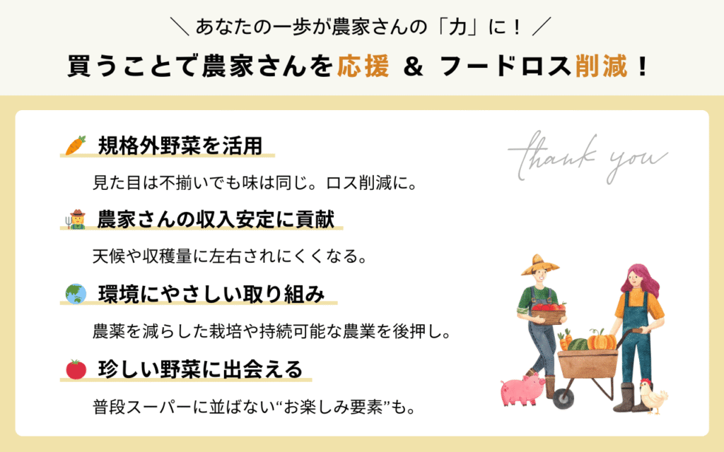 規格外野菜や端境期の野菜も購入でき、農家さんの収入安定や食品ロス削減に貢献できます。