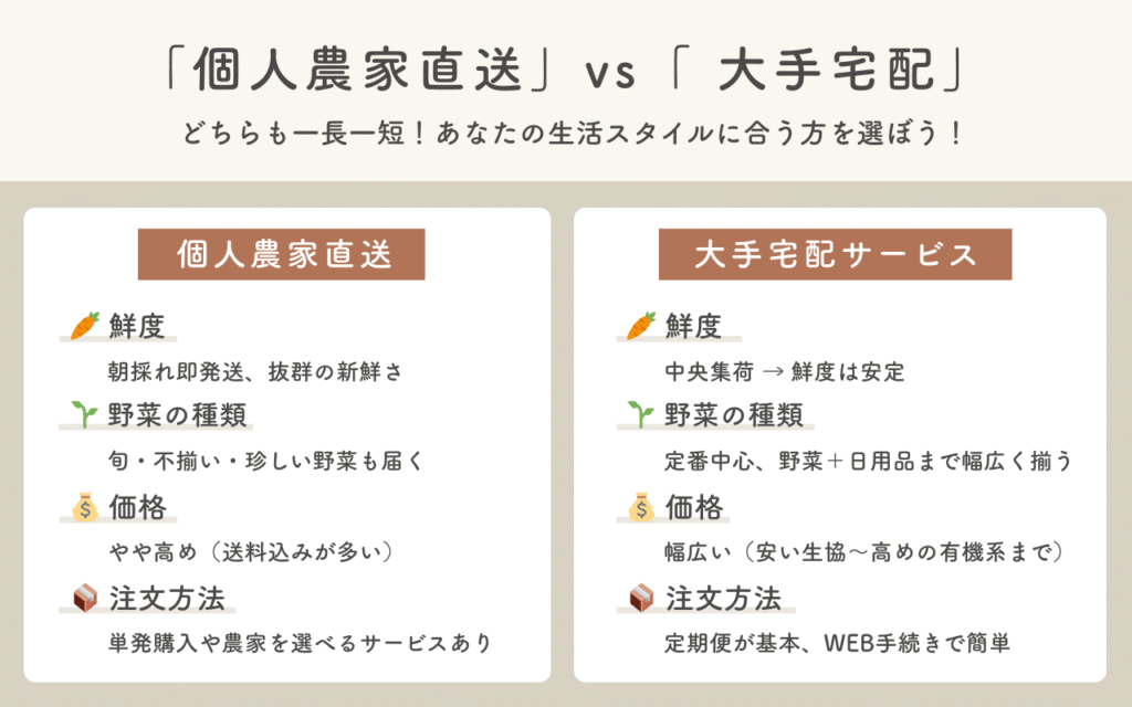 個人農家から直接届く宅配と、オイシックスやコープなどの大手宅配サービスには、それぞれ異なる特徴があります。