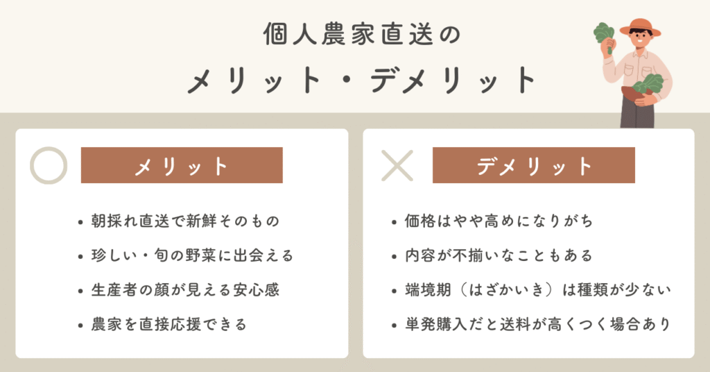 まずは、個人農家さんから野菜宅配を受けるメリット・デメリットをあげていきます。
