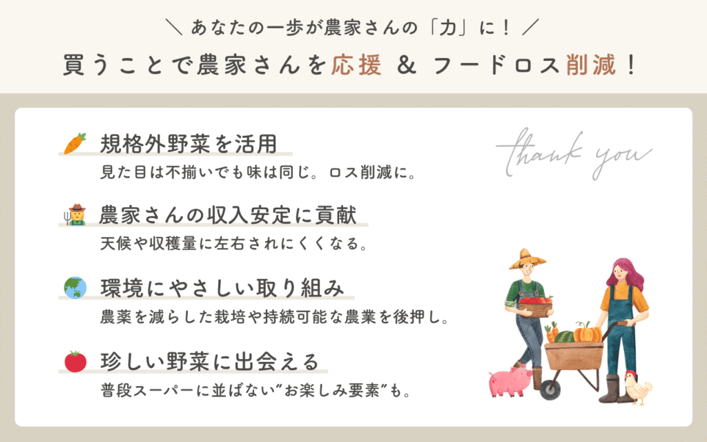 規格外野菜や端境期の野菜も購入でき、農家さんの収入安定や食品ロス削減に貢献できます。