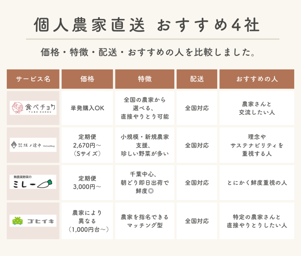 ここからは、おすすめの「農家直送・個人農家宅配サービス」を4つご紹介します。