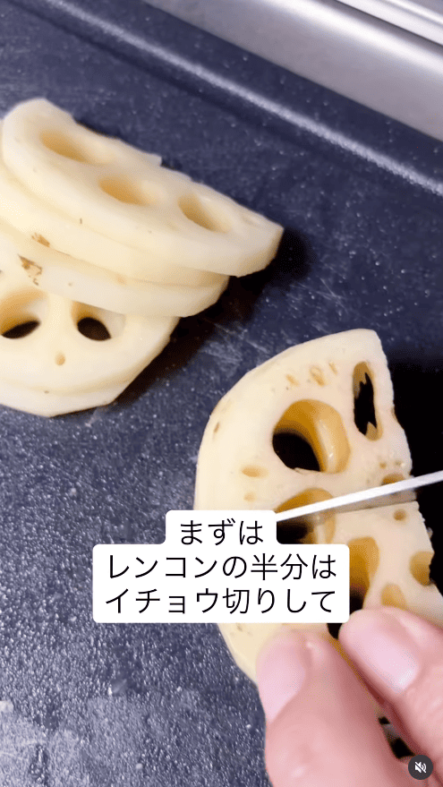 粗みじんレンコンで中はふわっと、スライスレンコンで外はシャキッと仕上がります。