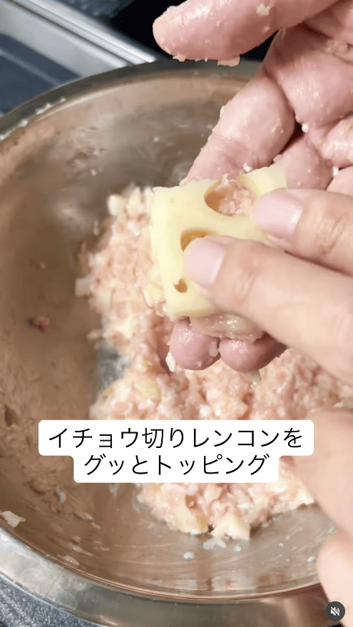 5.500円玉くらいの大きさに丸め、上にいちょう切りのレンコンをギュッと押し付けてまんじゅう型に整える。