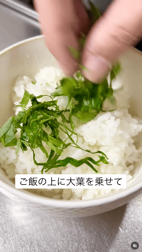 12.丼にごはんを盛り、大葉を敷く。