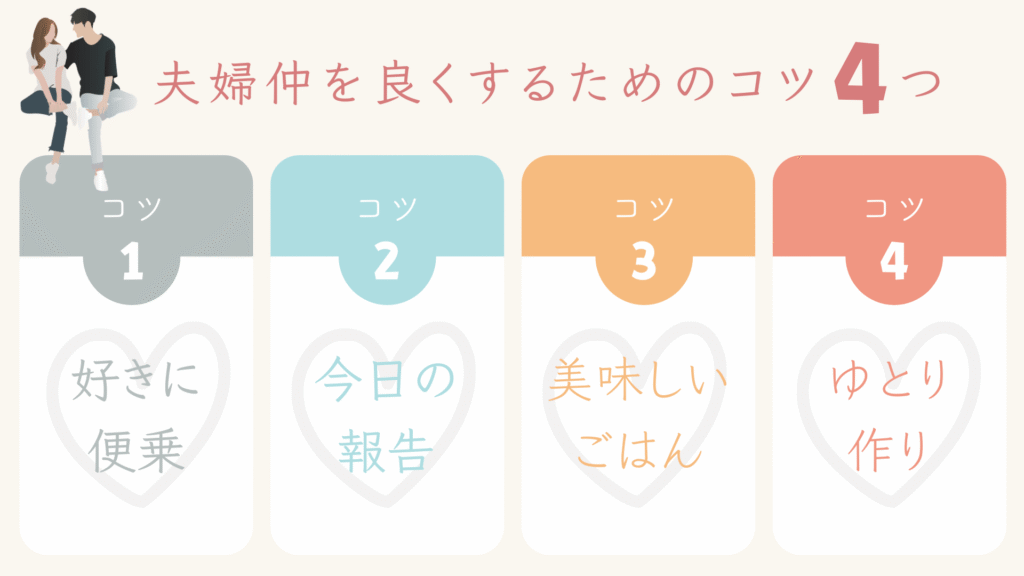 ここからは、実体験を交えながら夫婦仲を良くするためのコツ4つをご紹介します。