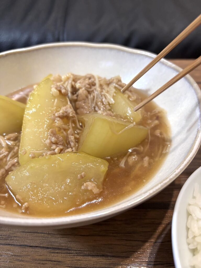 トウガンも初めての野菜だったので、夫がどのように調理するか悩んでいたのですが、「トウガンの鶏そぼろ煮」を作りました。