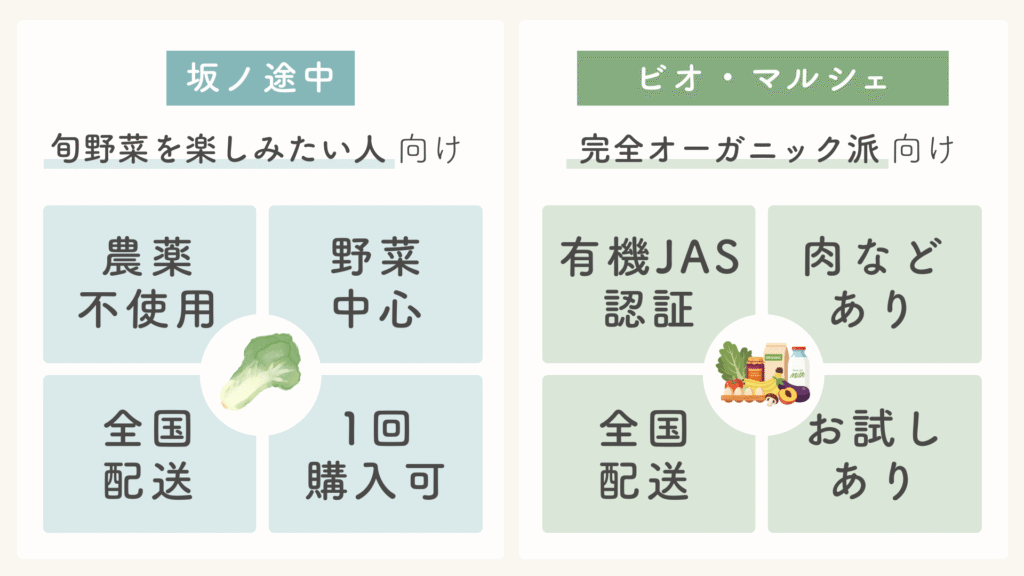 坂ノ途中とビオ・マルシェはどちらも安心して食べられる野菜を提供していますが、そのこだわり方には違いがあります。