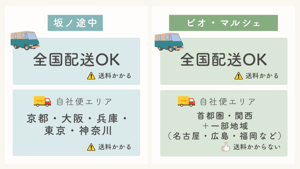 坂ノ途中とビオ・マルシェでは、配送の仕組みに次のような違いがあります。