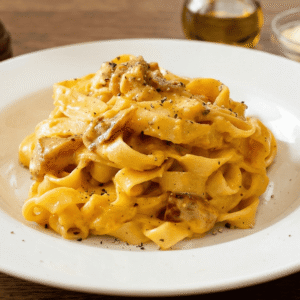生クリーム不要で、卵黄と粉チーズだけで作る濃厚ソースが絶品です。