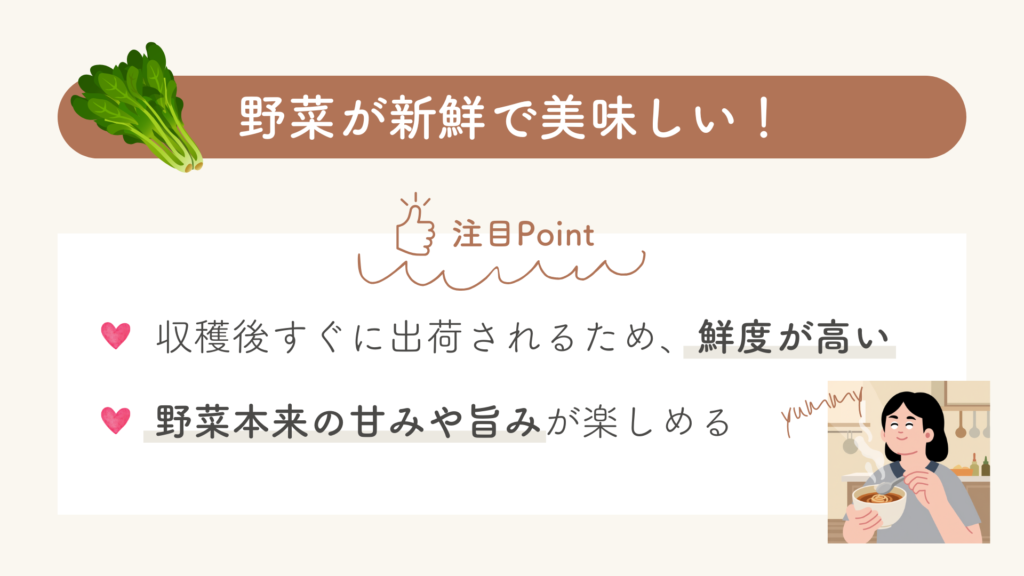 特に、届いた野菜を見て「今日は何を作ろう?」と夫と話して、料理の幅が広がることは、とても楽しい体験になっています。