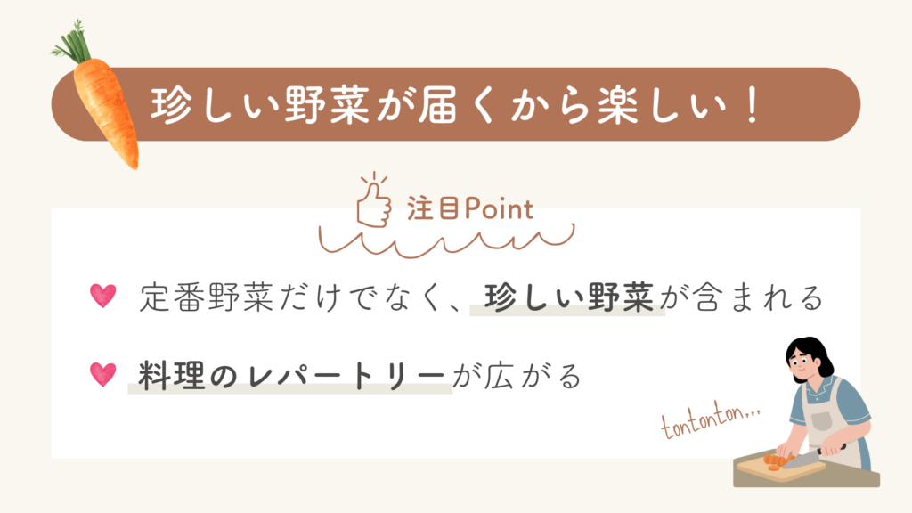 珍しい野菜や初めて出会う食材も届くので、「今日は何を作ろう?」と考える楽しさがあり、料理のマンネリ解消にも役立ちます。