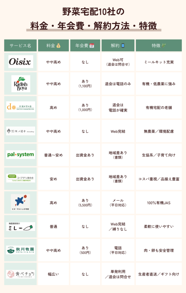 おすすめ野菜宅配10社の特徴【比較表でサクッと確認】